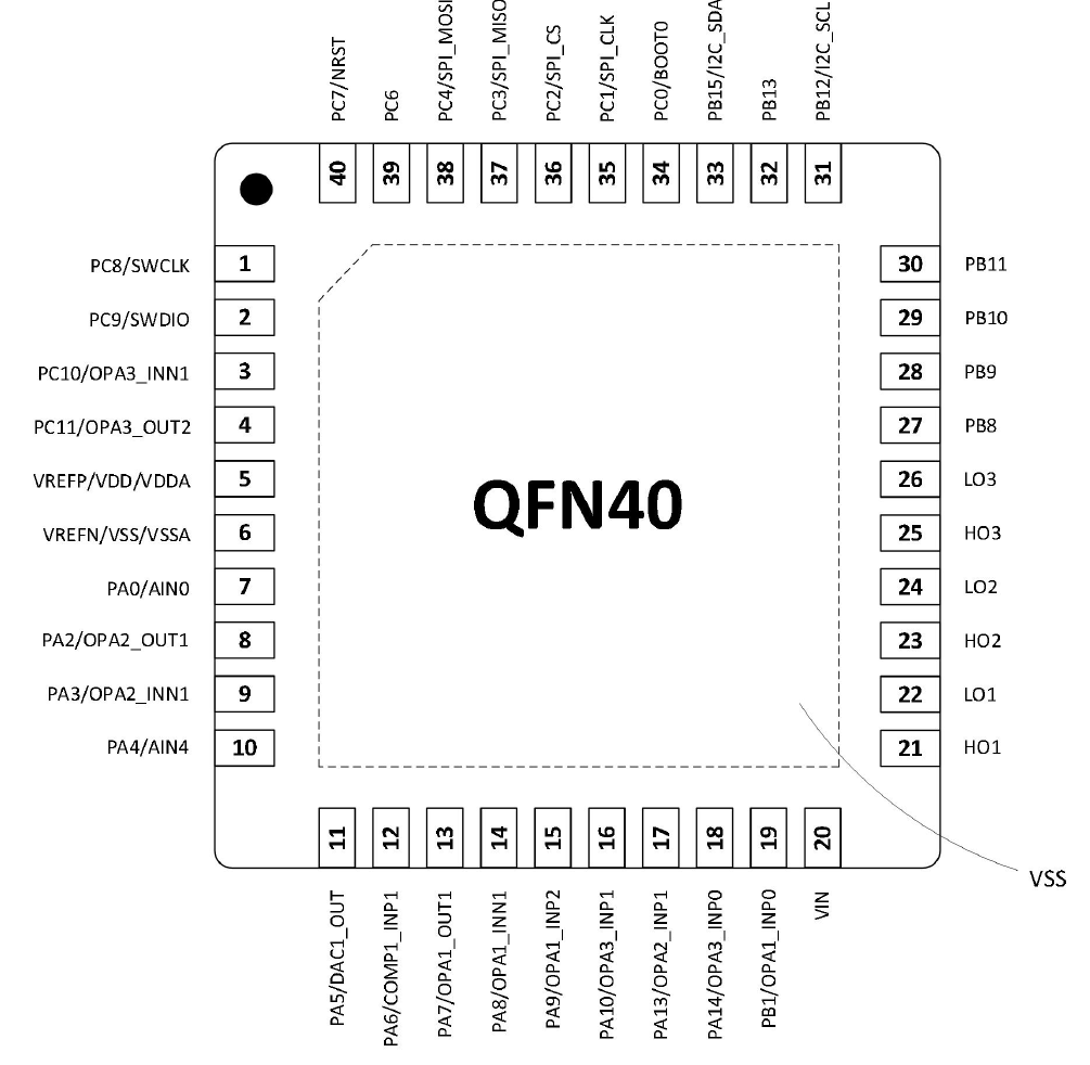 Built-in 1 simple RTC, supports alarm clock function, can run in low power consumption mode, provides a wake-up source for the chip. Built-in analog circuit includes: 1 12-bit ADC dual-channel simultaneous sampling and protection, as well as up to 10 external channels, 3 analog operational amplifiers with PGA mode, 4 analog comparators with threshold PGA, 1 power-on/power-down/under-voltage reset circuit POR/PDR/BOR, and 1 internal reference voltage for on-chip ADC sampling.