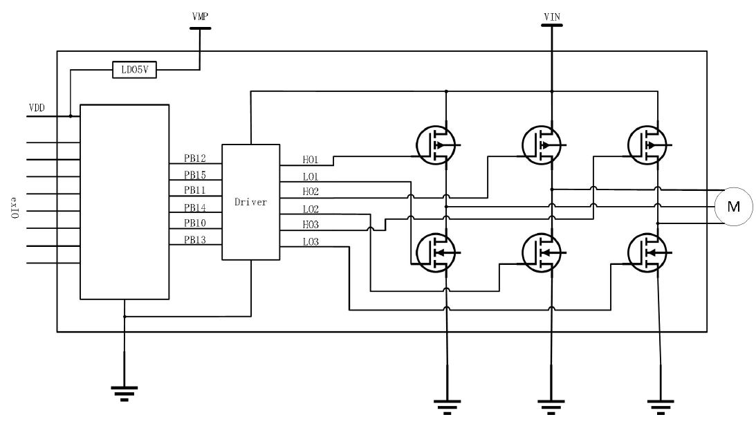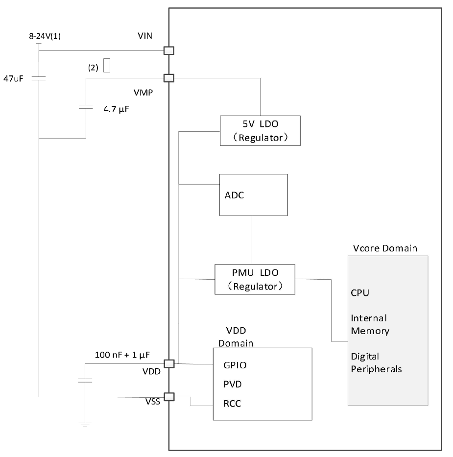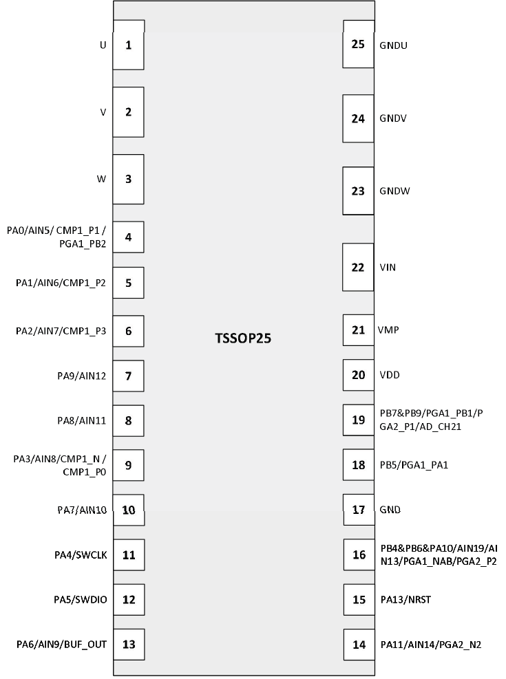 The integrated analog circuit includes: one 12-bit ADC (supporting 14 external analog input channels and 6 internal input channels), two programmable operational amplifiers (with PGA1 supporting dual-phase current polling amplify), two voltage comparators (incorporating BEMF neutral point real-time detection),one power-on/powerdown reset circuit (POR/PDR), one Programmable Voltage Detector/Brown-Out Reset circuit (PVD/BOR), one internal temperature sensor, one internal reference voltage (sampled via the on-chip ADC), and an internal analog power supply circuit delivering 2.4V/3.6V outputs.