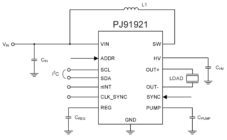 The PJ91921 differential driver achieves low distortion waveforms and quiet actuator operation. All settings are adjustable through the digital front end to reduce the BOM. Data and configuration parameters are easily communicated to the PJ91921 through its two wire I2C interface. A flexible deep FIFO enables the streaming of digital waveform data for playback or the transmission of burst data for more bandwidth efficiency. The PJ91921 also integrates 1.5 kB of RAM waveform memory to generate waveforms with minimal communication bandwidth.